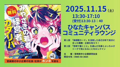 プログラム一覧 地域 県内全域 県北地区 県南地区 県央地区 県西地区 実施形式 対面方式 オンライン方式 対面・オンライン併用方式 類型 タイプ1(オープンカンパニー) タイプ2(キャリア教育) タイプ3(インターンシップ) 業種 農業・林業・漁業 建設業 製造業 電機・ガス・水道 情報通信業 運輸業 卸・小売業 金融・保険業 不動産業 飲食業 医療・福祉 教育・学習支援業 サービス業 公務員 NPO その他 実施期間(月) 実施日数 希望なし 1日 2日~4日 5日~13日 14日~1ヶ月 2ヶ月以上 対象学年 大学1年 大学2年 大学3年 大学4年 修士1年 修士2年 博士 専門1年 専門2年 短大1年 短大2年 高専4年 高専5年 高専専攻科1年 高専専攻科2年 その他(自由入力) 留学生の受入 不可要相談可指定しない 障がいがある方の受入 不可要相談可指定しない 募集状況 募集中指定しない フリーワード 検 索 検索結果/ 全201件 並び替え 新着順 締切 タイプ1 1DAY 新商品アイデア会議に参加し、新商品を生み出す現場をリアルに体験! あとで見る 実施形式 オンライン方式 地域 県央地区 新商品がどのようにリリースされていくかがわかる! 自分もアイデアを出して、新商品アイデア会議に参加できる! New 締切間近あと5日 株式会社ワン・ステップ タイプ3 5DAYS 新商品アイデア会議に参加し、新商品を生み出す現場をリアルに体験! あとで見る 実施形式 対面・オンライン併用方式 地域 県央地区 新商品がどのようにリリースされていくかを学びたいあなたに! 自分もアイデアを出して、新商品アイデア会議に参加できる! New 締切間近あと5日 株式会社ワン・ステップ タイプ2 10/25(土)開催★アナタの知らない世界~DXのカギ〈EDI〉とは?~ あとで見る 実施形式 オンライン方式 地域 県央地区 自社開発のエンジニアに興味がある! 小売業や流通業界にも興味がある! 地域貢献に携わりたい! New 締切間近あと4日 株式会社ひむか流通ネットワーク タイプ1 みやざきの若者と経営者との「カタリバ」 あとで見る 実施形式 対面方式 地域 県央地区 ぶっちゃけ「宮崎で働くってどう?」 秋の宮崎同友会合同企業説明会2025 交流カフェイベント開催!自己分析やぶっちゃけトーク! New 九州情報機器コンサル株式会社 タイプ1 [文理不問]JAみやざきオンライン事業セミナー あとで見る 実施形式 オンライン方式 地域 県央地区 宮崎で働きたい!地域に貢献したい! JAみやざきって何をしている組織だろう?という疑問に回答! 採用担当者に何でも聞いてみよう! New 締切間近あと2日 宮崎県農業協同組合(JAみやざき) タイプ2 【2Days】~\動かせ!/街も心も食卓も!~ あとで見る 実施形式 対面方式 地域 県北地区 お客様に感動を与えるエンターテイナーを体験! お客様の声を聞き、チームで考え、成果発表をして、フィードバックまでできる! 記憶に残る2日間を仲間とともに体験しませんか? 株式会社マルイチ タイプ1 業界研究!60分でチキン業界を丸ごと知ることができます! あとで見る 実施形式 対面・オンライン併用方式 地域 県央地区 江夏商事株式会社 タイプ2 【2Days】~\動かせ!/街も心も食卓も!~ あとで見る 実施形式 対面方式 地域 県北地区 お客様に感動を与えるエンターテイナーを体験! お客様の声を聞き、チームで考え、成果発表をして、フィードバックまでできる! 記憶に残る2日間を仲間とともに体験しませんか? 株式会社マルイチ タイプ1 みやざきの若者と経営者とのカタリバ あとで見る 実施形式 対面方式 地域 県央地区 ぶっちゃけ宮崎で働くってどう? 宮崎県中小企業家同友会 タイプ2 1DAY企業理解コース 5つの部署の先輩社員と交流しよう! あとで見る 実施形式 対面方式 地域 県央地区 鶏業界について知ってみない?? 会社の雰囲気がわかる! 社会人ってどんな仕事をしているの?? 宮崎くみあいチキンフーズ株式会社 1234567次へ