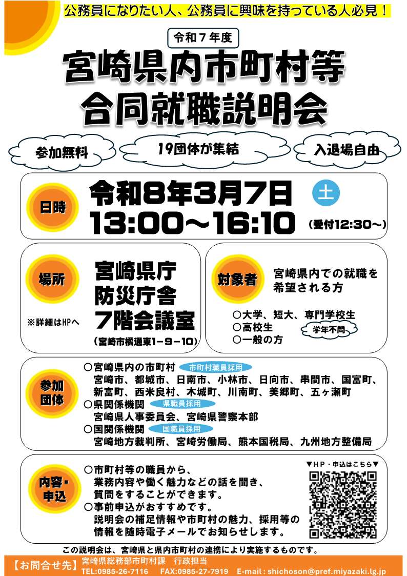 宮崎県内の市町村など、官公庁が一堂に会する合同就職説明会を開催します。 県内市町村で働く魅力や採用に関する情報などについて担当者から説明を聞き、直接質問することができます。県(県職員、警察職員採用関係)や国の関係機関も参加します。事前申込がおすすめです。説明会の補足情報や、市町村の採用等に関する情報を随時送付します。申込みや参加団体等の詳細は下記ホームページからご覧ください。