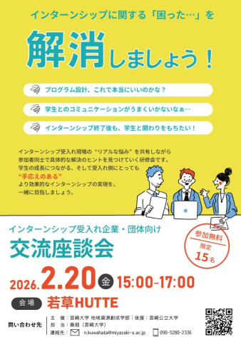 宮崎大学 地域資源創成学部より、インターンシップ受け入れ企業・団体向けの交流座談会のお知らせです。